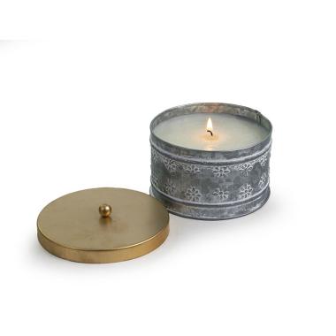 - decorative round box measuring 5.75 inches in diameter. It is made of galvanized metal, giving it a durable and rustic appearance. The box features a gold-painted lid, and the surface is embossed with a brushed white petals design, which creates a textured and visually appealing floral pattern. This combination of materials and design makes it both functional and stylish, perfect for storage, a decorative piece or candleholder