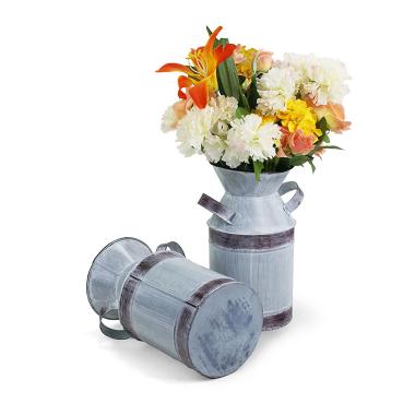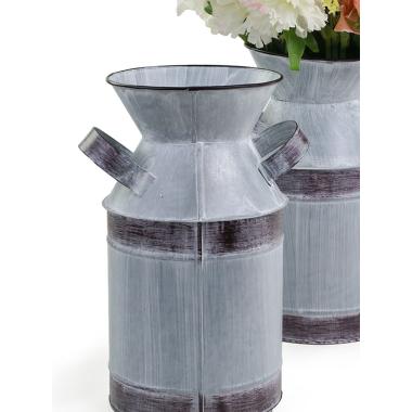 - Decorative piece with a Rustic Charm! Made of Galvanized Metal, brushed White Wash Texture to soften its appearance. The rust undertone adds depth and character, making it appear aged and weathered. Crafted as a vase, its shape is perfect for holding floral arrangements, decorative accents, or it would fit beautifully in farmhouse-style decor, garden settings, or even modern spaces that embrace mixed textures. The side handles provide both functionality and an old-fashioned touch.